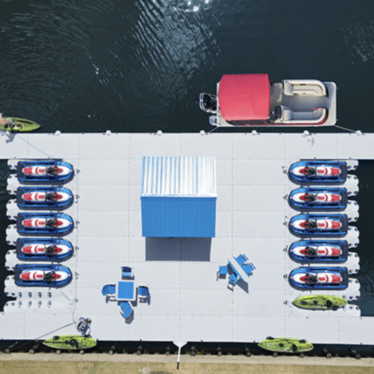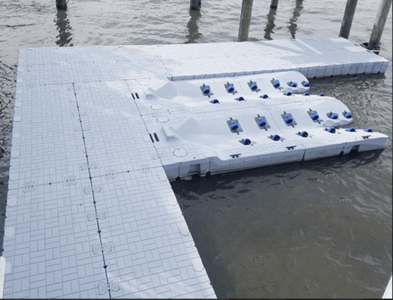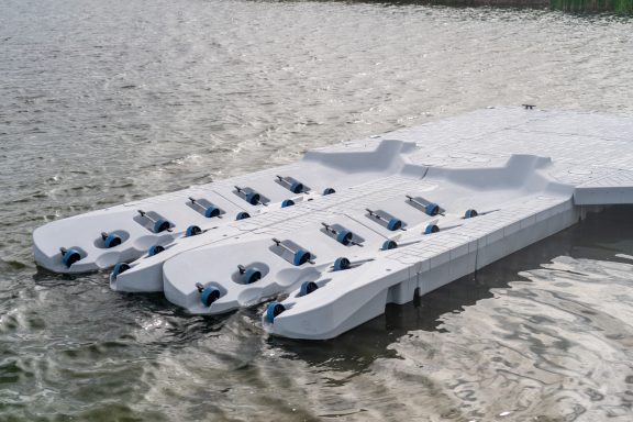 A two-piece PWC floating lift design offers a universal solution for all PWC owners who want to easily and safely store their personal watercraft. The modular design allows for easy installation, adjustment, and customization, making it suitable for even the largest three-seater PWCs.