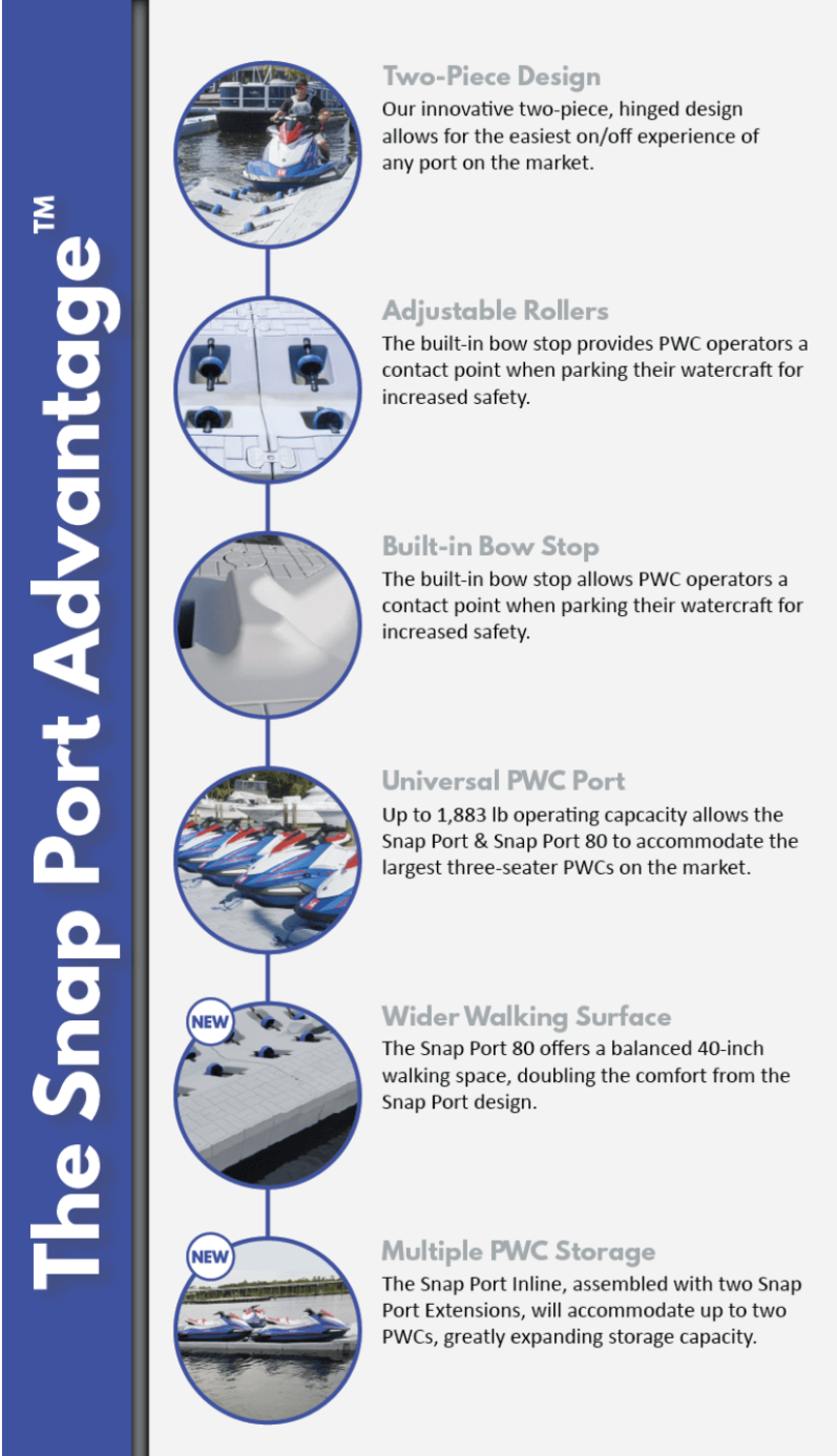 The Snap Port 80 combines a robust operating capacity of 1883 lbs with a spacious 20-inch walking surface on either side. It can easily accommodate the largest 3-seater PWCs on the market while ensuring unmatched durability and stability. Similar to the Snap Port, its 2-piece design allows the entrance section to hinge upon entry and exit, providing a smooth experience for the user. With the reliability of the Snap Port series and these enhanced features, it’s the top choice to keep your PWC dry.